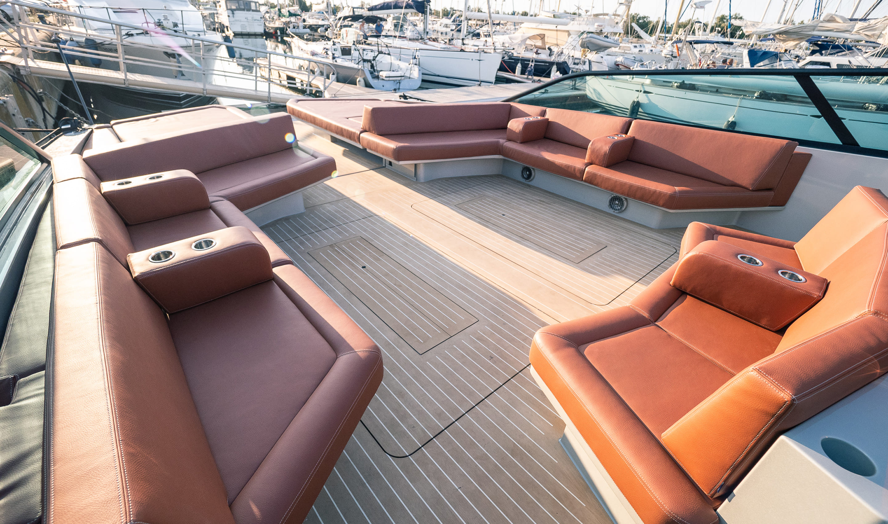 Neptune verzorgde het volledige zit- en slaapcomfort voor de Waterdream 65″ California. Alle bootkussens en ligbedden zijn volledig op maat ontworpen, geproduceerd en bekleed, met gebruik van hoogwaardige comfortschuimen die zorgen voor optimale ondersteuning en blijvende vormvastheid.
